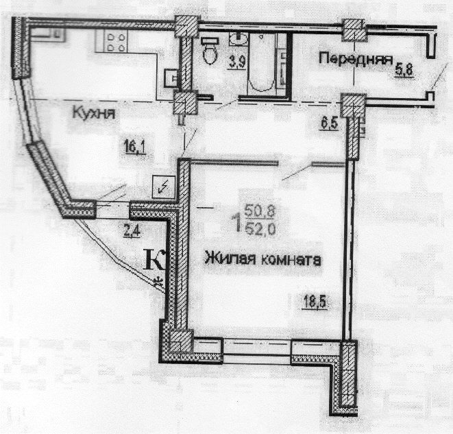 8 этаж. S кухни 16,1 кВ. м.; комната 18.5 кВ. м. Общая площадь 50,8. S балкона 1.20