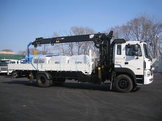 Новый бортовой грузовик Hyundai HD170 с манипулятором — 2013 модельный год из Кореи. Рядный 6-цилиндровый двигатель — 290л. с., 6-ступ. мех. коробка передач. Подвеска — рессоры спереди/сзади, резина спереди/сзади спарка 12хR22.5. Грузоподъемность борта 10000 кг, длина борта 7.2 метра, ширина 2.45 метра — палуба деревянная. Объем бака — 200 литров.