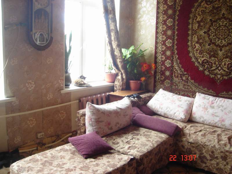 Высота потолков 4 метра, без балкона. Санузел совмещенный. Пластиковые окна, обои, линолеум.