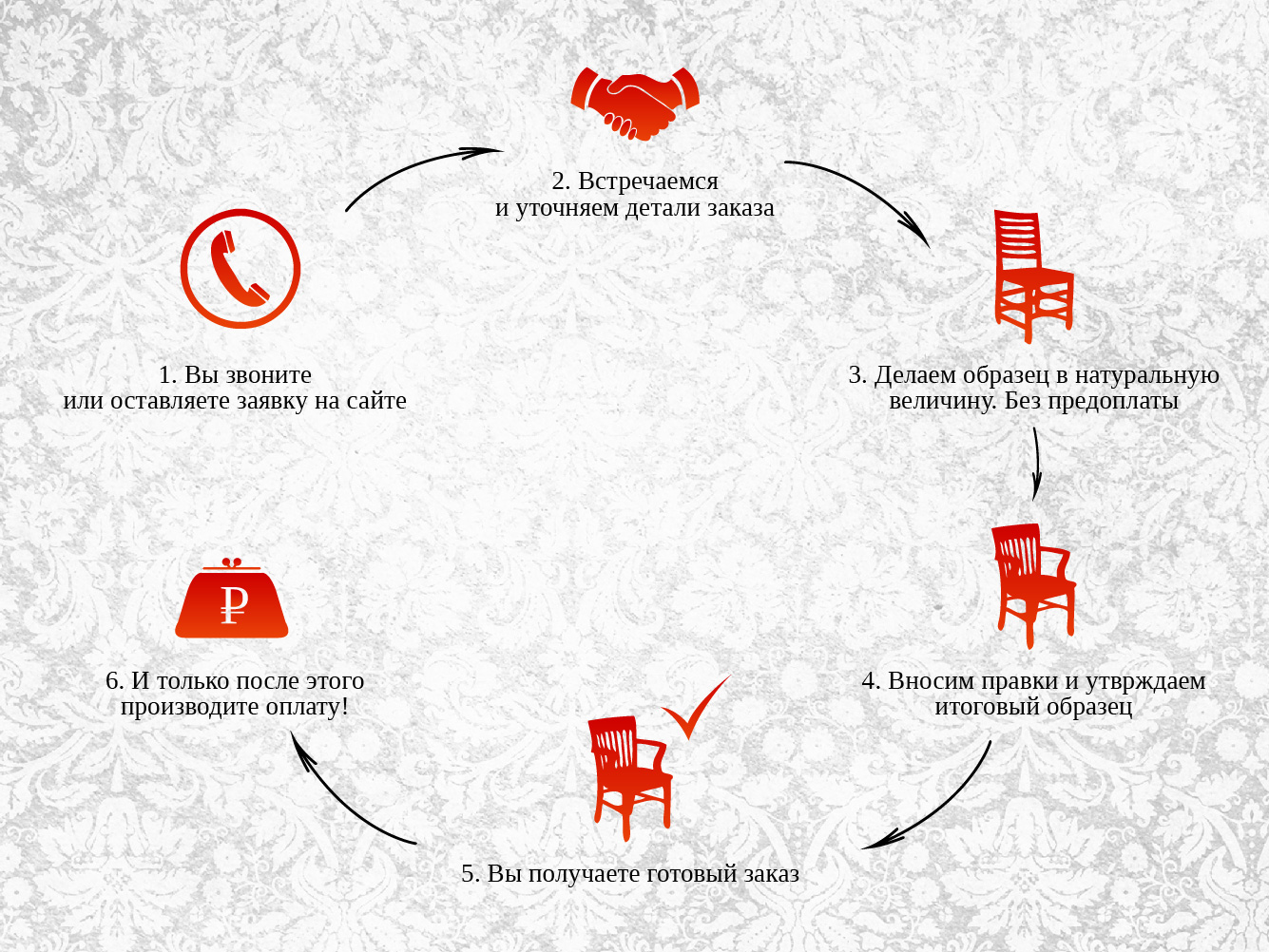 Обратите внимание на схему нашей работы: мы сначала изготовим образец в натуральную величину, и только после того, как вы его увидите, пощупаете, посидите на нём, и мы добьёмся его максимальной комфортности, сделаем итоговый заказ. И оплачиваете только после того, как приняли нашу работу!