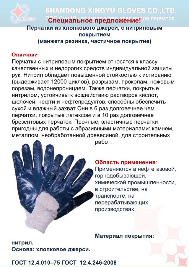 Нитриловые перчатки, прочнее и эластичнее, чем ПВХ. Маслобензостойкие, в 12-15 раз прочнее и долговечнее брезентовых рукавиц. Являются аналогом рукавиц КР, но превосходят их по сроку носки в 6-7 раз.