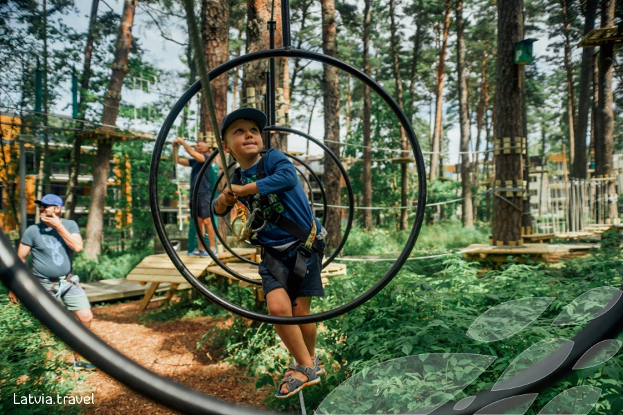 - «Детская» трасса включает в себя простейшие элементы-аттракционы, рассчитана на детей от 4 лет, ростом от 100 см. Располагается на высоте 1,5 – 2 метра. Состоит из 5-10 заданий и заканчивается горкой, общая протяженность около 25-50 метров. Родители могут помогать в прохождении трассы, сами находясь на земле.