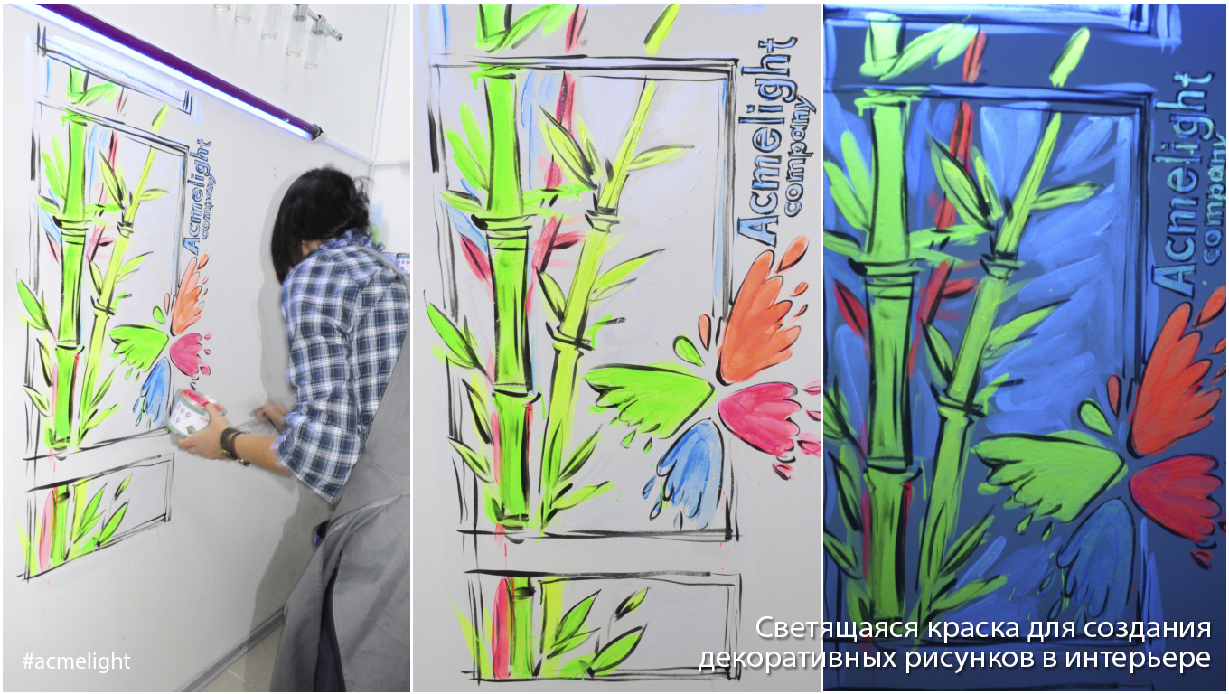Светящаяся краска Acmelight Interior используется в дизайне и декоре помещений, создании художественных картин, различных по сложности поверхностей, лестничных маршей.