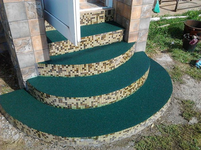 С проблемой скользких и грязных ступеней сталкивается каждый из нас, особенно в осенне-зимний период. Мокрые ступени становятся небезопасными, как только на них попадает влага. Бороться с этим сложно, но реально. Самым эффективным и надежным материалом для обустройства крыльца признано наливное покрытие из резиновой крошки с противоскользящим эффектом по всей площади крыльца. Покрытие по стоимости не дороже обычного перфорированного коврика. Покрытие обеспечивает максимальный комфорт, безопасность, и за счет длительных эксплуатационных свойств, служит долгое время даже в условиях большой проходимости, выдержит не только пешеходную, но и транспортную нагрузку. Покрытие имеет однородную текстуру, что не дает ни поскользнуться, ни споткнуться. Покрытие обладает шумопоглощением и внешней привлекательность, не требует особого ухода – достаточно помыть струей обычной воды. Материал не содержит органические растворители. Области применения охватывают сразу несколько секторов социального пользования: офисные центры, оздоровительные учреждения, коттеджи, детские сады и школы, больницы и поликлиники, банки и торговые комплексы. Наш специалист бесплатно приедет к Вам для консультации и осмотра площадки.