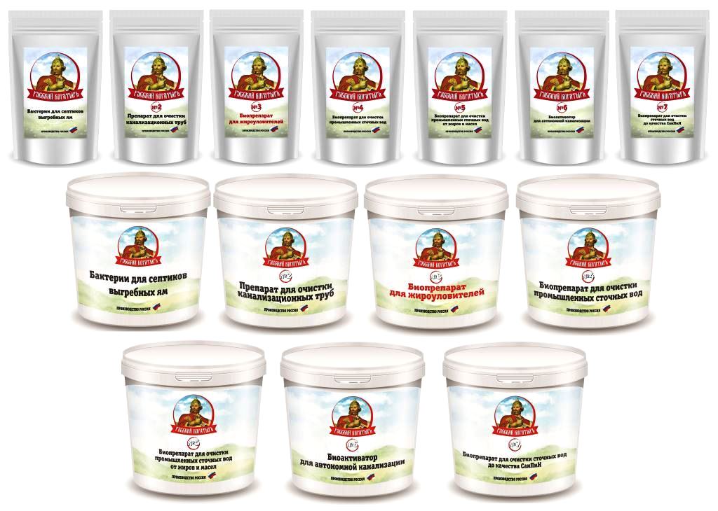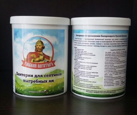Бактерии для септиков и выгребных ям Русский Богатырь. Содержаться аэробные и анаэробные бактерии. Удаляют неприятный запах канализации, удаляют органические, масляные, жировые загрязнения. Используются: в септиках, выгребных ямах, жироуловителях, автономной канализации, канализационных трубах, промышленных очистных сооружениях.