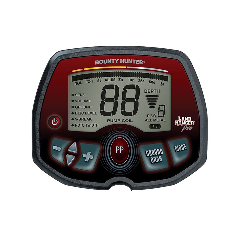 Bounty Hunter Land Ranger Pro является главной моделью в профессиональной серии PRO. Металлоискатель имеет 7 предустановленных режимов поиска. Каждый из этих режимов может быть откалиброван под конкретные условия поиска. Вы можете выбрать один из следующих предустановленных режимов: Монеты, ювелирные изделия, артефакты, 2х тональная идентификация, 3х тональная идентификация, 4х тональная звуковая идентификация или режим All Metal - все металлы. А еще прибор имеет 5-сегментный индикатор глубины, который откалиброван для целей размером с монету.