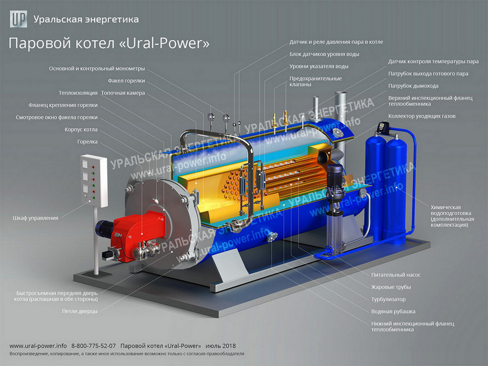 Паровые котлы (парогенераторы) газовые, дизельные, на мазуте, электрические, твердотопливные парогенераторы «Ural-Power» UPT (дрова, уголь, пеллеты) производительностью от 50 кг пара в час до 17 000 кг пара в час, с регулируемыми параметрами температуры (от 110°C до 400°C) и давления (от 0,5 атм до 140 атм).