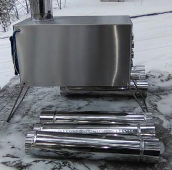 Теплообменник "Вектор ВУ", состоит из металлического короба с проходящими сквозь него трубками с оснащенным выходом под дымоходную трубу, складных ножек и входного отверстия для размещения под ним газовой плиты или горелки, вентилятора (12 В), наличие регулятора.