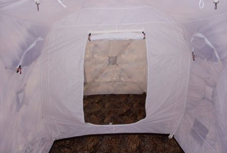 - Внутренний тент с перегородкой из ткани Оксфорд и дном на молнии. Перегородка крепится при помощи молнии и делит палатку на два помещения. В большем по площади можно организовать жилой модуль с установкой туристических раскладушек, а в другом хранить снаряжение и вещи. Внутренний тент дублирует основную палатку, оборудован герметичным дном на молнии, карманами на стенках и карабинами для подвешивания вещей или фонарика.