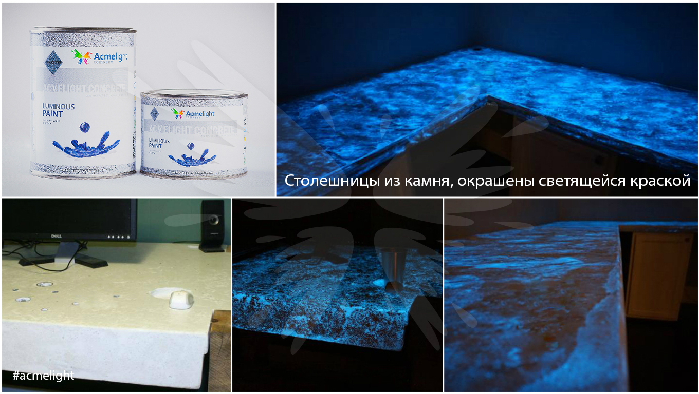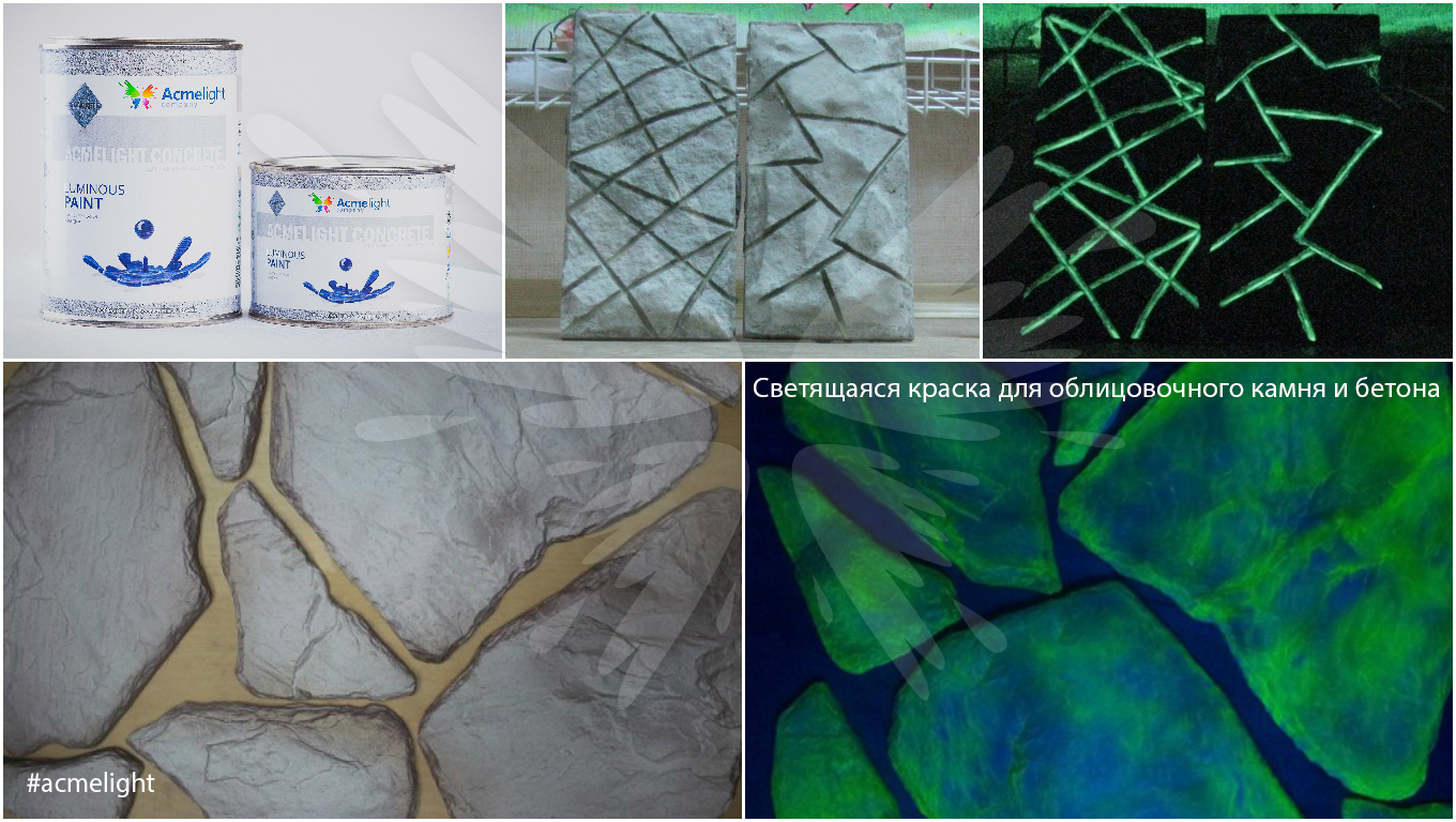 Светящаяся краска AcmeLight Concrete подходит для нанесения в качестве декора на бетон, камень натуральный и искусственный, отделочные материалы из керамики и камня и др. поверхностей.
