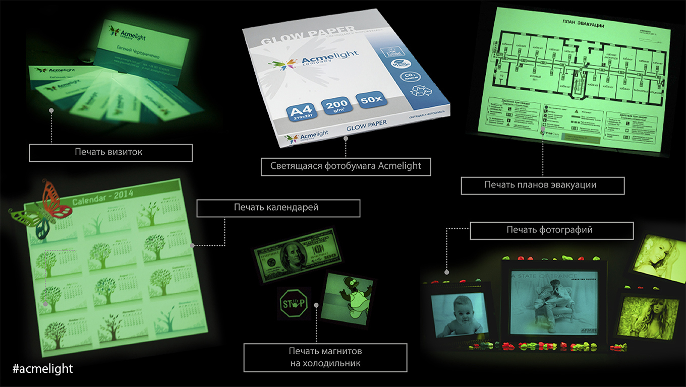 Если вам хочется, чтобы не только ваши любимые фото светились в темноте, а и магниты на холодильник, визитки, календари и открытки и пр., то достаточно купить листы фотобумаги формата А3 или А4 производства Acmelight и распечатать желаемый текст и рисунок в любой полиграфии.