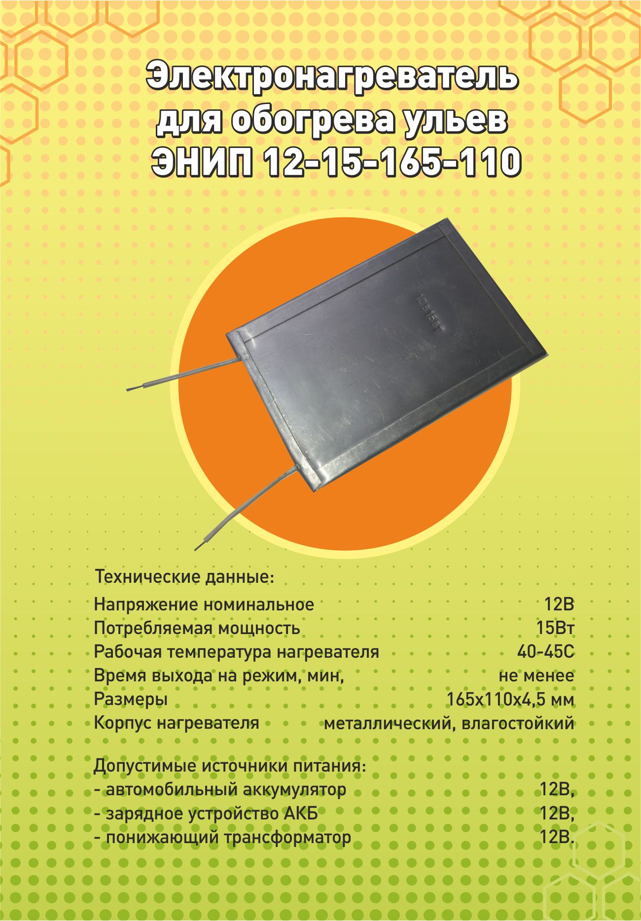 • электронагреватель для обогрева ульев 15Вт, 12В;
