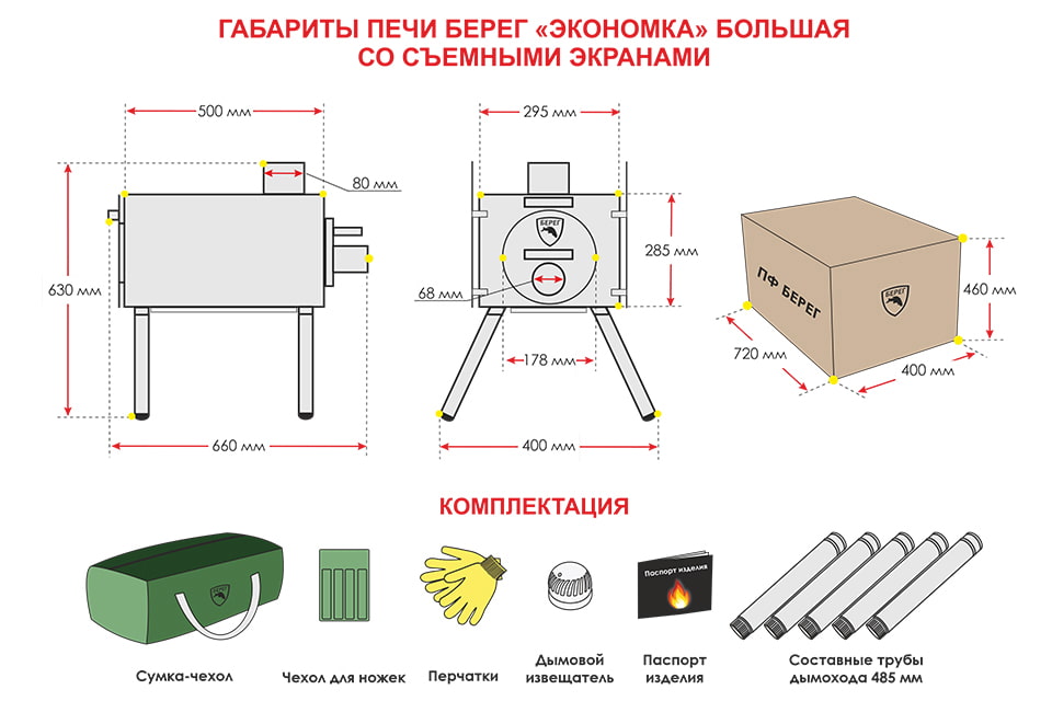 Конструкция печи включает в себя: топочную камеру (короб), искрогаситель, съемную топочную дверцу и стакан, для регулирования подачи кислорода, 4 отражающих экрана, дымоход, съемные ножки.
