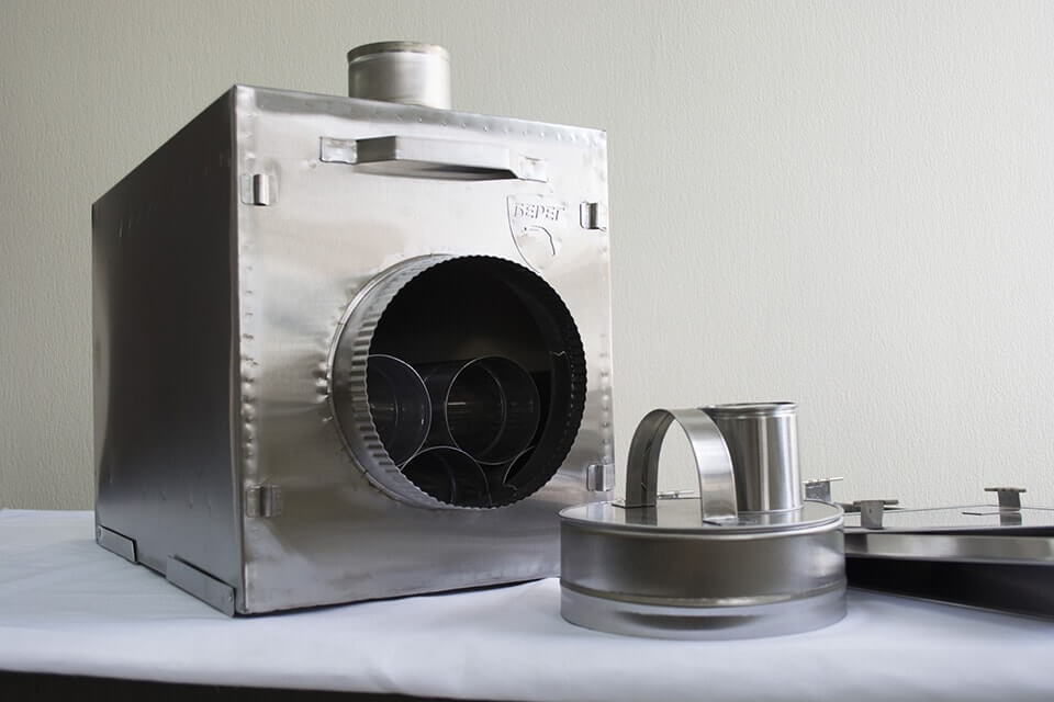 Топочная камера печи, изготовлена из нержавеющей стали 0.8 мм, это оптимальный показатель для не большого веса и продолжительного использования. В верхней части, внутри короба, расположен искрогаситель, который увеличивает эффективность работы печи и пожаробезопасность. Образуется камера догорания, которая не позволяет теплу вылетать на прямую «в трубу», в связи с этим, возрастает КПД печи.