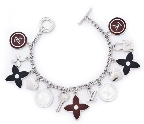 Стальной браслет Louis Vuitton с черными и бордовыми подвесками.