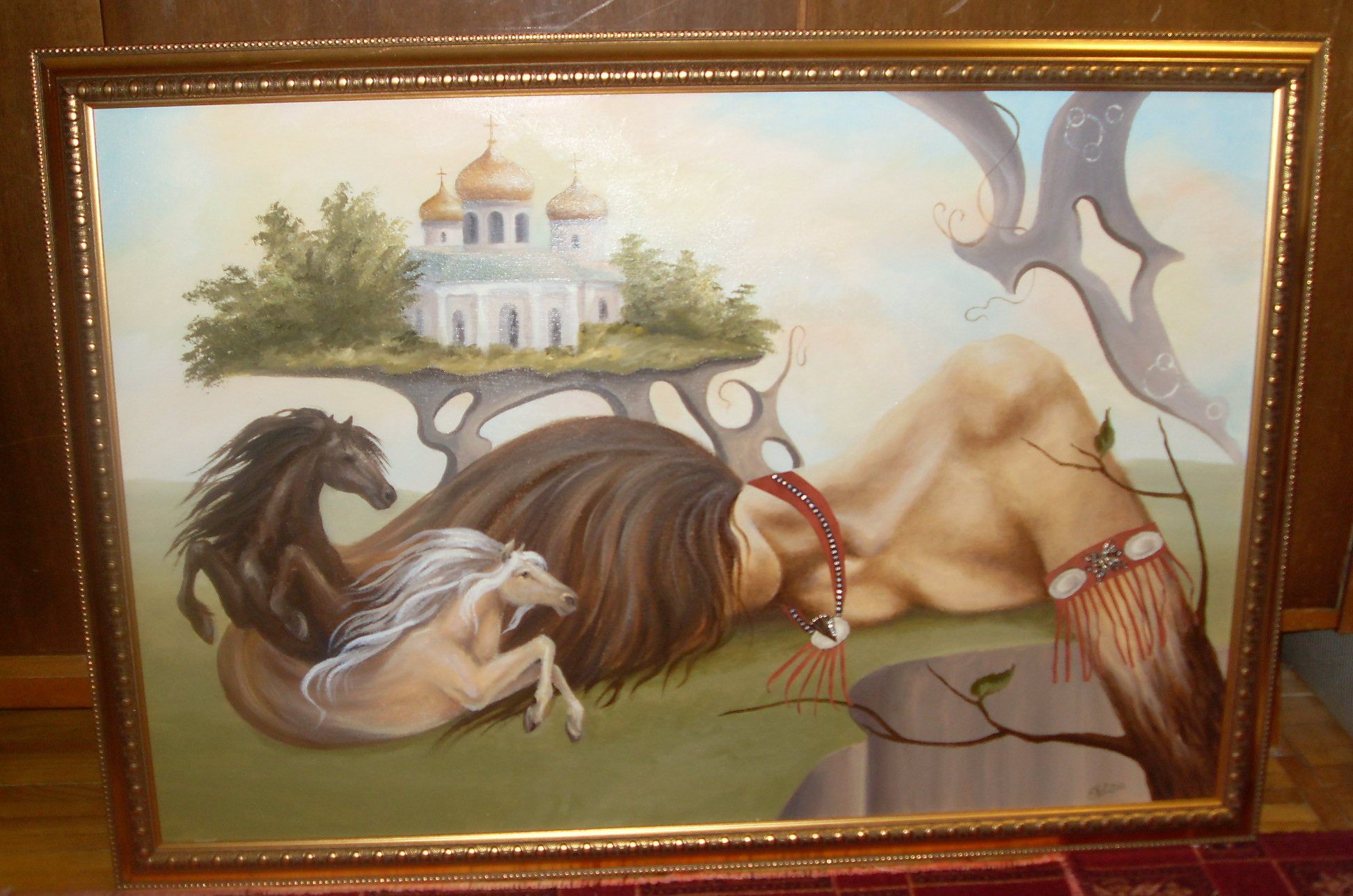 На картине так же имеются встроенные элементы: такие, как кусочки натур. кожи, стразы, кованые элементы и натуральные кусочки оленьих рогов, кусочек бивня мамонта .