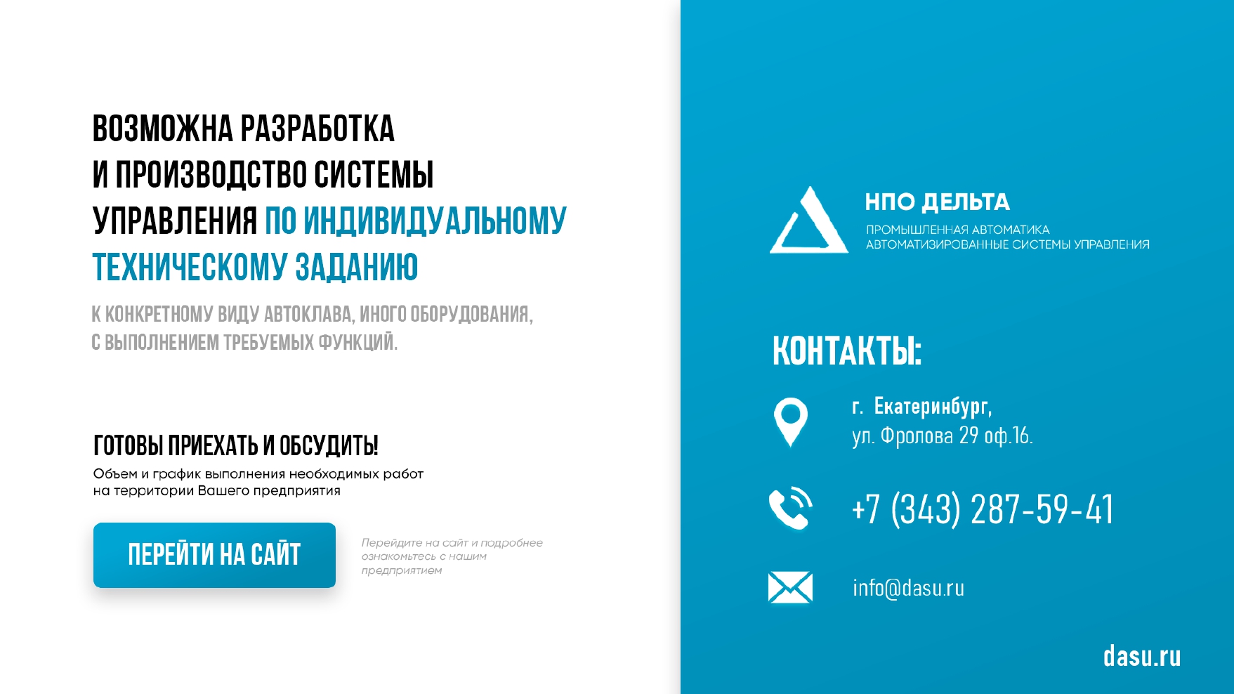 НПО «Дельта» г. Екатеринбург , специализирующееся на поставках энергосберегающих технологий и систем автоматизации технологических процессов, серийно изготавливает Системы автоматизации автоклавов: