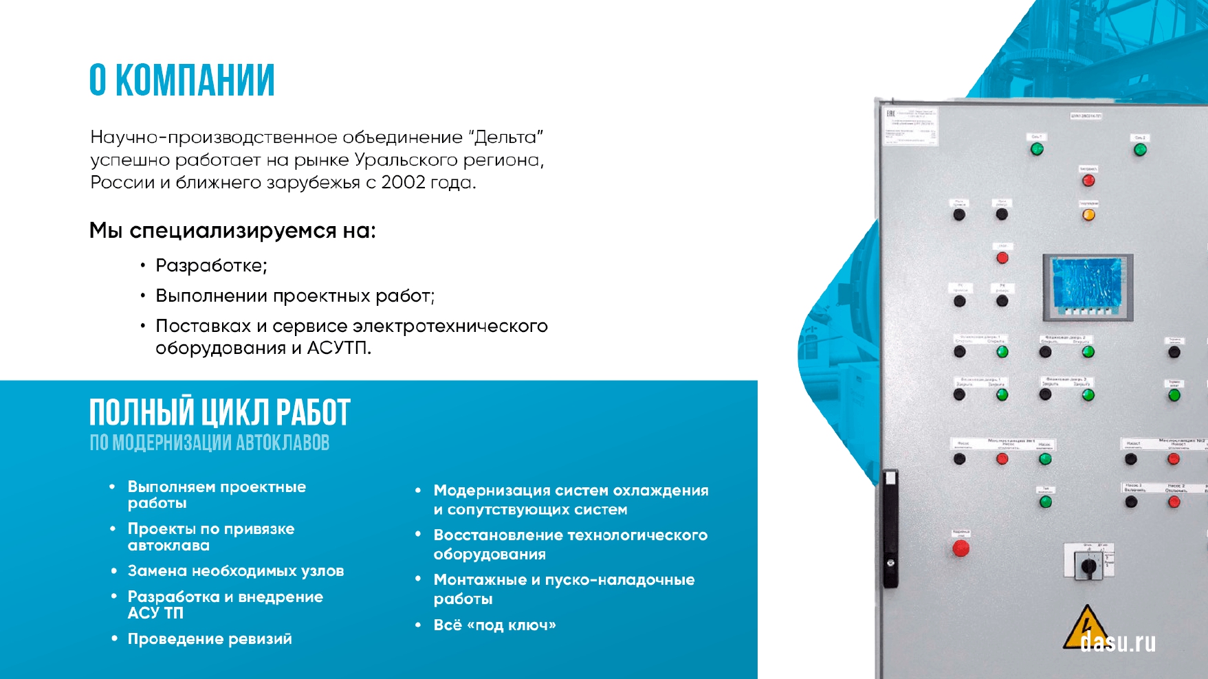 НПО «Дельта» г. Екатеринбург , специализирующееся на поставках энергосберегающих технологий и систем автоматизации технологических процессов, серийно изготавливает Системы автоматизации автоклавов АП-291