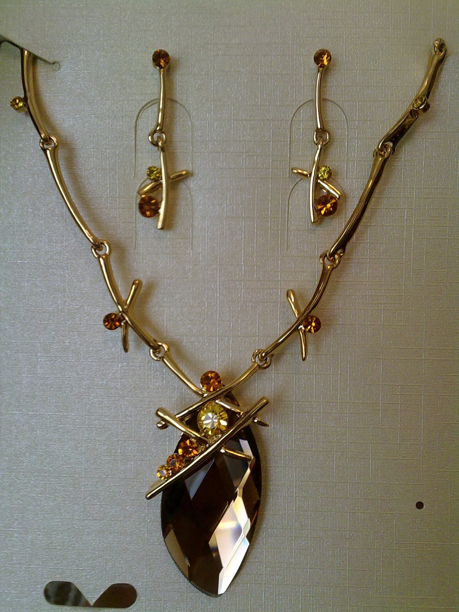 Набор очень оригинален. Цепочка выполнена в виде соединенных между собой веточек, с использованием кристаллов Svarovski, а также кулона, выполненного из ограненного стекла-зеркала.
