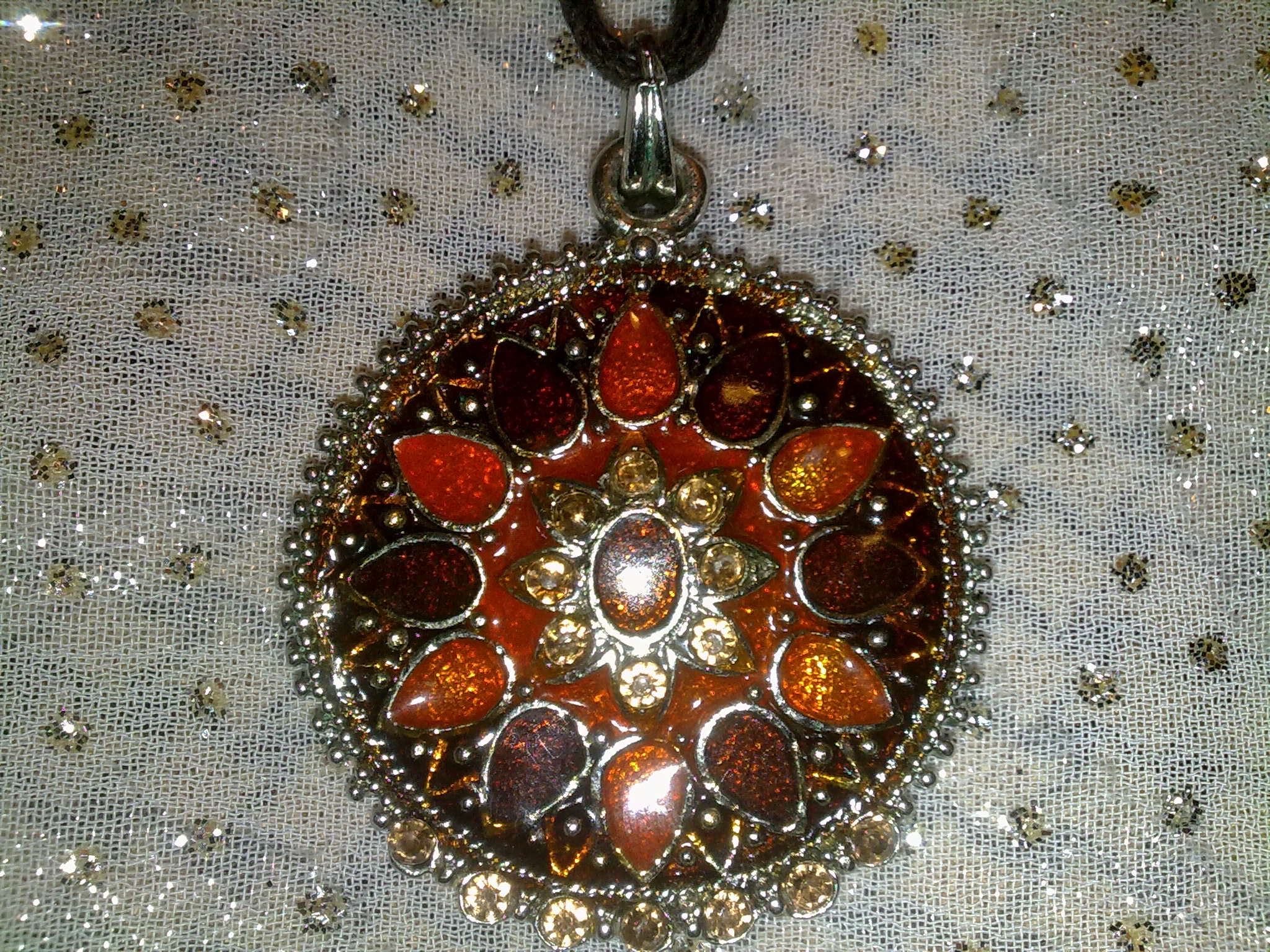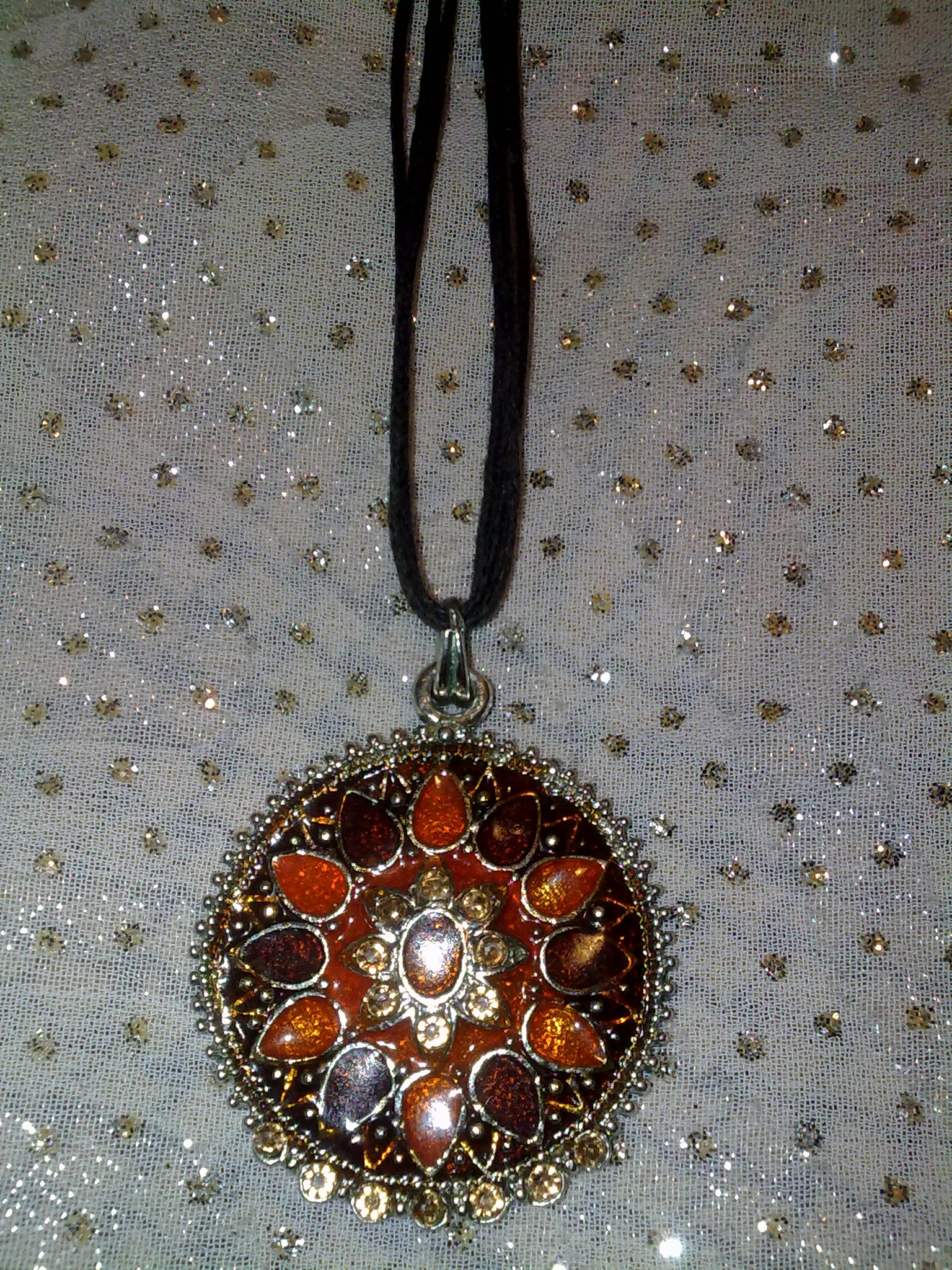 Медальон выполнен из сплава, покрытого ювелирной краской с вкраплениями из стразов. Медальон на коричневом шнурке длиной 45 см. Очень оригинальный, стильный аксессуар.