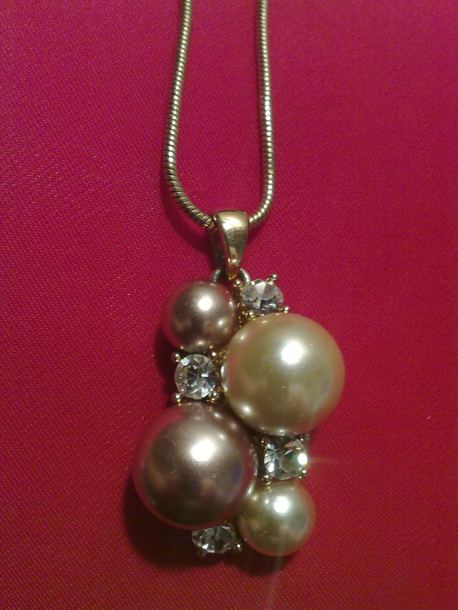Оригинальная вещица. Кулон выполнен из жемчуга 2-ух оттенков и страз. Цепочка золотого цвета длиной 40 см. Необычное, но в тоже время элегантное решение вашего образа.