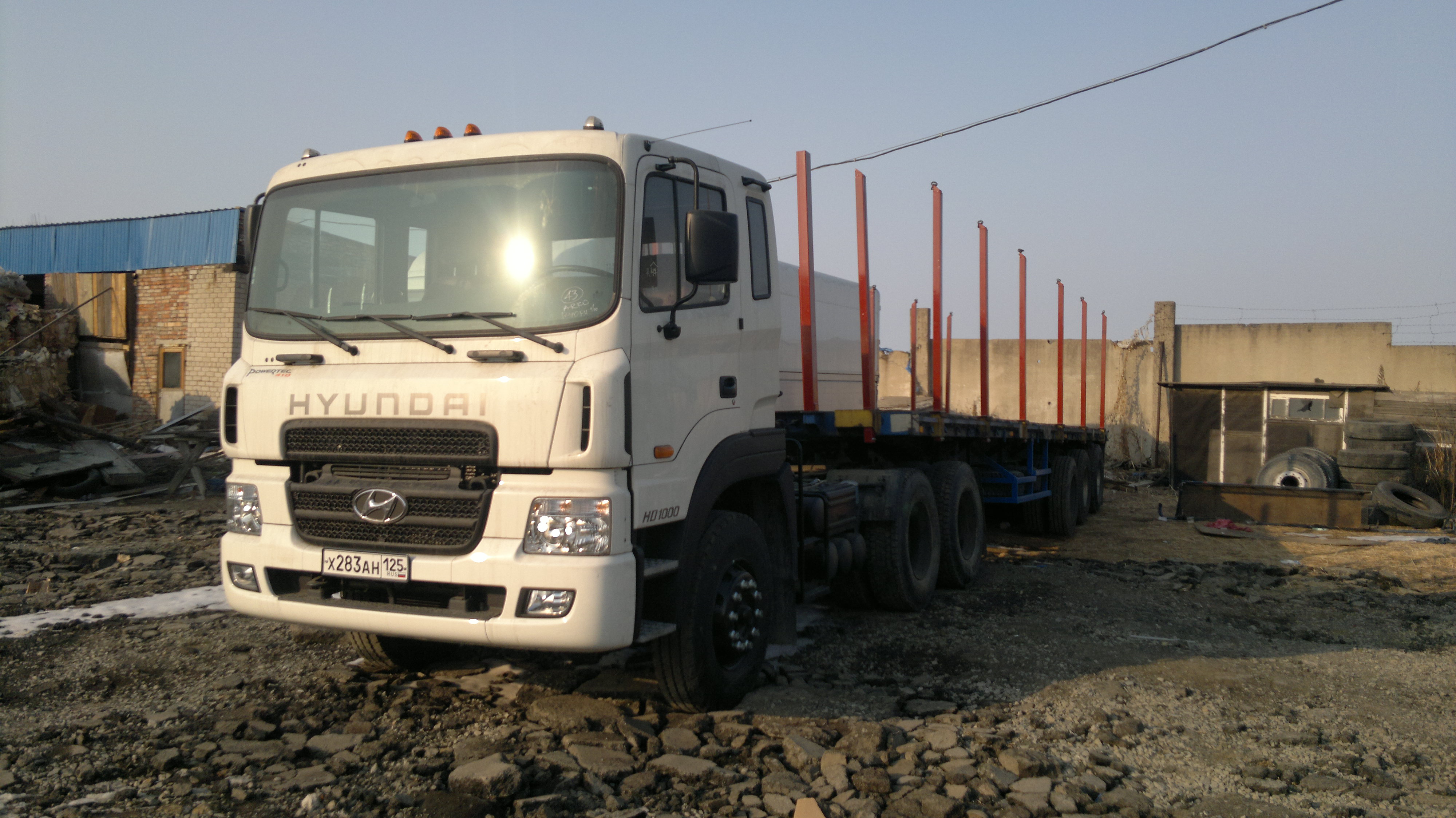 HYUNDAJ HD 1000 тягач седельный 2011г. в., мощность ДВС 410 квт/л. с., 3-х осный. Телега JINDO HW DLR 3-х осная, площадка: длина 12,20 ширина 2,48, рога съемные, контейнеровоз: 2-а 20 000 футовых или 1-н 40 000 футовый. Машина в идеальном состоянии, есть все документы и разрешения, шофера профисионалы 1-го класса. Перевозим различные груза по всей России и за ее пределами. Цена договорная.