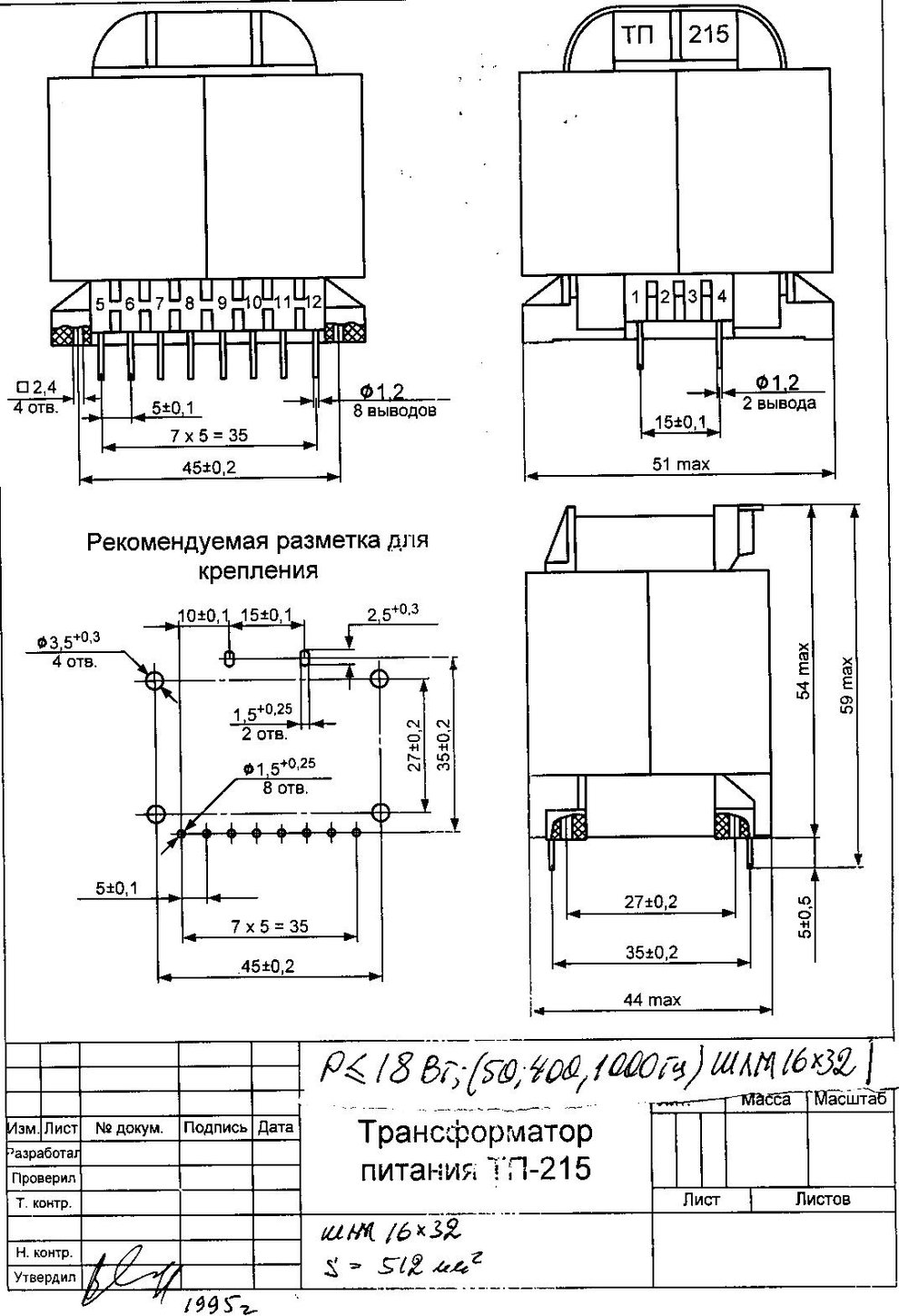 Трансформатор ТП-215-(18 Вт) – любые выходные параметры в пределах мощности типоразмера, частота сети 50, 400, 1000 Гц На данном типоразмере серийно изготавливается более 155 типономиналов Трансформатор питания ТП-215 (18 Вт) ГОСТ 14233-84(50,400,1000 Гц