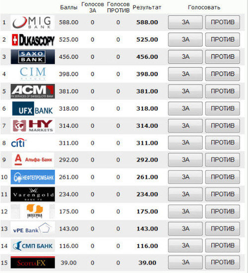 16 января Академия Masterforex-V открыла голосование по выбору лучшего банка брокера 2012 года. Открытое голосование, участие в котором примут трейдеры форекс, из 15 представленных банков определит лучшего, информирует в рубрике «Новости России» журнал «Биржевой лидер». Однако, отметим, что на момент старта голосование все конкурсанты поставлены в разные возможности. Так, например, «Мигбанк» располагает 588 стартовыми очками и 1 местом на данный момент, в то же время швейцарский «Dukascopy» с 525 очками располагается на 2-ом месте. Отечественные же банки брокеры «Нефтепромбанк» и «Альфа-банк» замыкают первую десятку, а «СМП банк» и вовсе предпоследний – 14. Справедливо ли это?