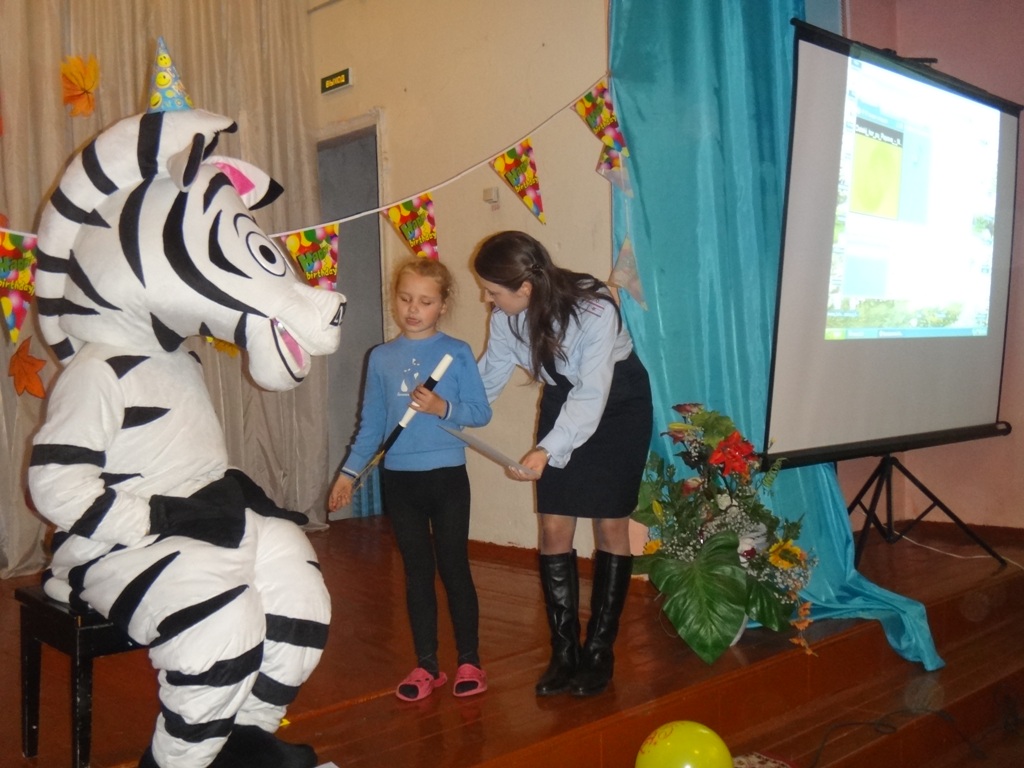 Дети постарше показали отличное знание правил, а малыши их внимательно слушали. После все спели поздравительную песню, и в зал вошла виновница торжества. Удивление сменил радостный детский смех. Зебра поздоровалась с детьми, предложила всем загадать желания и помочь ей задуть праздничные свечи. А после детей ждал сладкий стол.