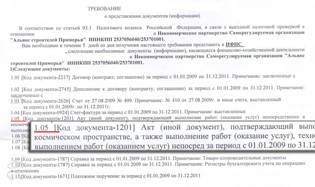Вот теперь понятно, почему народу порой приходится тратить время на визиты в районные налоговые, чтобы получить квитанции на оплату государственных поборов за владение автомобилем или квартирой. Приморским мытарям не до того, чтобы рассчитать платежи и выслать почтой квитанции по месту прописки налогоплательщика. Взоры налоговиков устремлены в звездные дали.В «Альянсе строителей Приморья» слегка опешили, получив из налоговой инспекции «Требование о предоставлении документов (информации)». Причем, как написано в бумаге «в связи с выездной налоговой проверкой». Как любит говорить сатирик Михаил Задорнов, готовы?