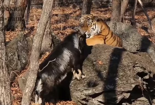 В сафари-парке произошел уже второй инцидент между козлом и тигром, живущими в одном загоне. Первый случай имел место быть чуть более недели назад. Тогда козёл Тимур долго "выпрашивал" у тигра. Нервы у Амура сдали, когда козел забрался на его любимый камень и полез рогами вперед прямо в морду тигру. Хищник сделал две коротких оплеухи и сам отскочил от козла. Тимур похоже не понял, что случилось и буквально через минуту уже трусил следом за тигром по тропинке.