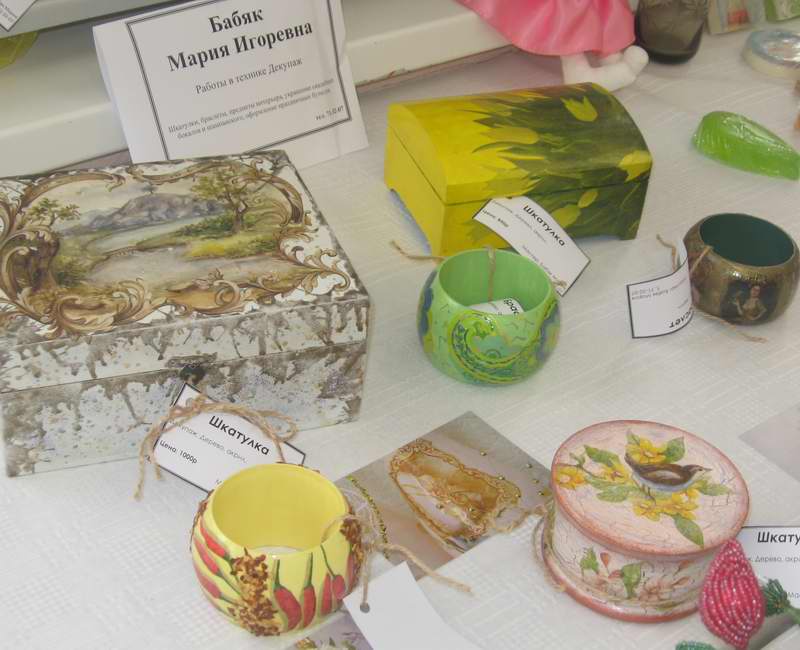 Украшения из натуральных камней и бисера, валянные шарфики, палантины, игрухи и разное прочее, мыло ручной работы, декупаж, открытки ручной работы, керамические изделия и самодельные бусины в технике "лэмпворк" и украшения с ними, цветы из полимерной глины, неотличимые от настоящих. И среди всего этого многообразия - ни единого повторения. Все это сделано руками мастериц из Владивостока, Артема, Фокино и других городов Приморского края.