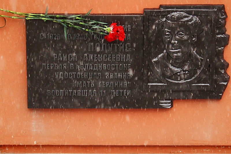 Торжественная церемония открытия мемориальной доски Раисы Полутис - первой женщине в городе, удостоенной звания "Мать-героиня", прошла во вторник во Владивостоке.Мемориальная доска установлена на фасаде дома №9 на улице Верхнепортовой, где проживала Раиса Полутис, воспитавшая 11 детей (четыре дочери и семь сыновей, один из которых приемный).
