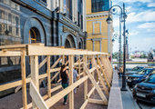 На самом деле фасад торгового комплекса начал обрушаться - на одном из участков упала гранитная плитка. Поэтому администрацией центра было решено поставить строительные леса, а фасад отреставрировать. Специалисты уже приступили к работе и в скором времени фасад будет восстановлен и леса убраны.