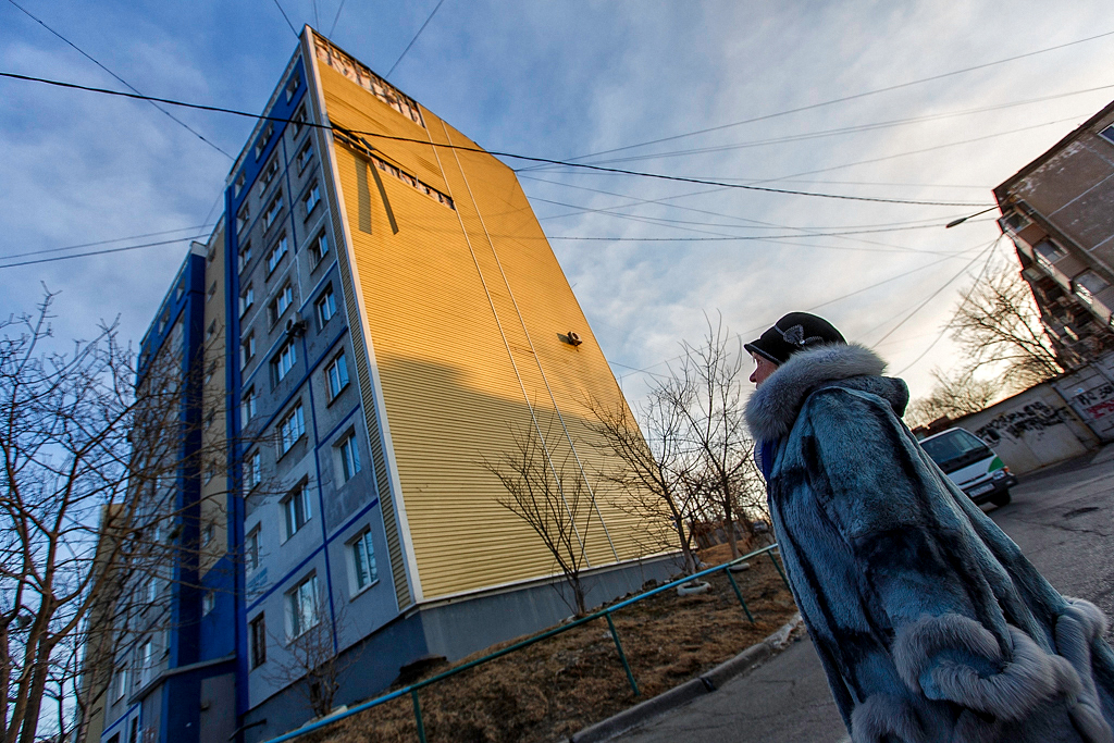 Боковая часть дома по улице Сабанеева, 13 во Владивостоке обшита сайдингом, но верхняя часть выглядит так, как будто обшивку сорвало ветром, либо подрядчик бросил объект, так и не достроив его. Однако оказалось, что сайдинг разобрали специально из-за того, что не прикрученная балка не давала покоя жильцам нескольких квартир.