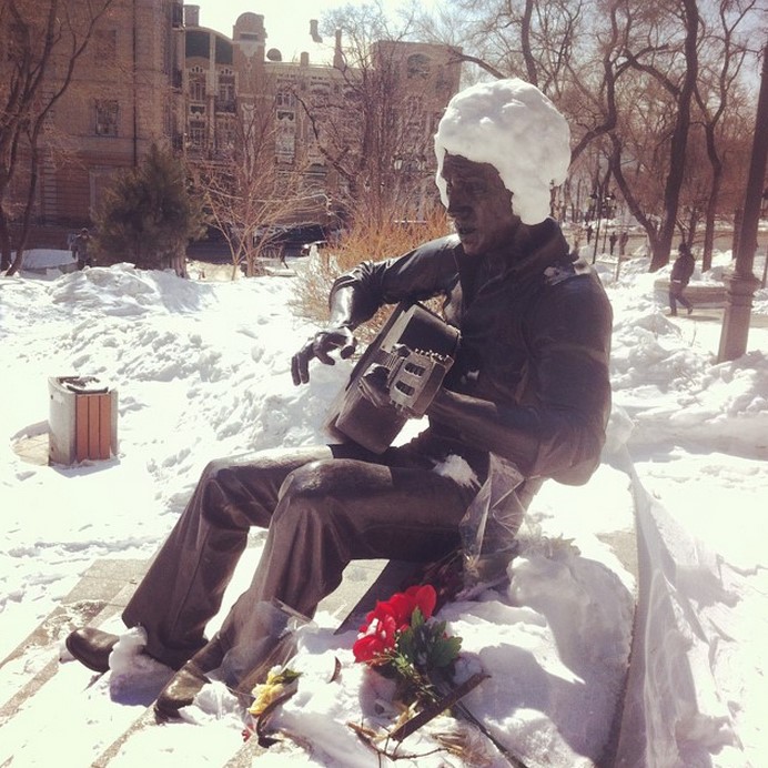 Во Владивостоке уже стало некой традицией надевать на памятники различные предметы одежды. В ход идут в основном шарфы и шапки. Но этой весной кто-то из горожан подшутил над памятником Владимиру Высоцкому, нарядив его в шапку из снега, которого нынешней весной во Владивостоке с избытком.