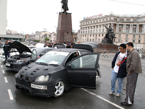 На центральной площади столицы Приморья в понедельник с утра припарковались около 50 автомобилей самой диковинной внешности. Хотя состязания должны определить победителя по части совершенства акустических систем, зрителям, явно интереснее аэрография навороченных тачек и необычный тюнинг авто.