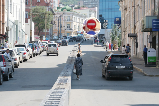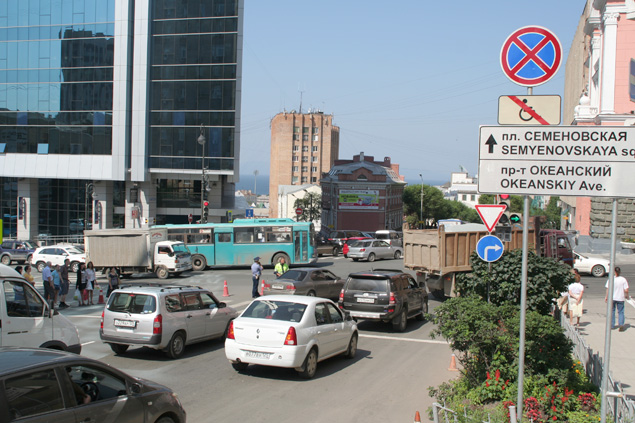 Спускаемся по Фонтанной на Океанский проспект мимо здания мэрии. В соответствии со знаком «только направо» рулим к Покровскому парку. И только там получаем возможность выехать на Алеутскую, которая движется со скоростью больной черепахи. Из железнодорожного тоннеля с Корабельной набережной выскакивают машины, и водители резко тормозят, видя, что проезд вверх по Семеновской заставлен оранжевыми конусами. Чтобы не оставалось никаких сомнений, что здесь на Океанский выезжать нельзя, половину проезжей части перегородила патрульная машина ДПС. Лишь автобусники в ус не дуют. Для общественного транспорта на Семеновской и на Мордовцева спецполосу выгородили бетонными блоками, и водители едут, как в Японии, по левой стороне. Каким-то образом на запрещенную полосу заехали несколько легковушек, и водители в растерянности метались в поисках просвета в разделительном «бордюре», пока они не попались на глаза автоинспекторам.