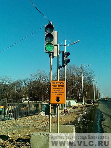 Вчера, 12 декабря, введен в эксплуатацию светофорный объект в районе дома №55 по улице Маковского. Светофор предназначен для безопасного пересечения пешеходами оживлённой проезжей части в районе остановки общественного транспорта "Амурский залив".Напомним, что в сентябре 2011 года в результате дорожно-транспортного происшествия были повреждены несущие конструкции надземного перехода. ДТП произошло по халатности водителя самосвала, двигавшегося по трассе с открытым кузовом. На трассу в этом районе в тот же день оперативно была нанесена "зебра" и установлены знаки дорожного движения, предупреждающие о наличии временного наземного пешеходного перехода. Но для большей безопасности пешеходов было принято решение установить на данном участке дороги светофорный объект, который работает по требованию пешехода путём нажатия спецкнопки.