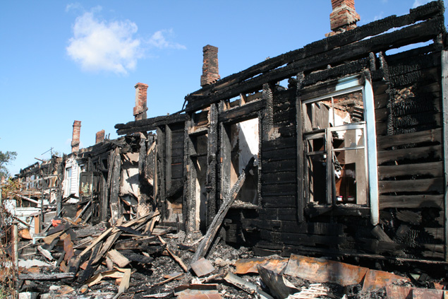 Район поселка Трудовое сейчас напоминает сцену из фильма ужасов: обгорелые остовы домов, по улице разбросаны одежда, игрушки, местные жители на каждого незнакомца смотрят со страхом и подозрением. И всюду чувствуется запах гари.Михаил и Нина Осипенко, жильцы квартиры № 9 недавно сгоревшего барака на улице Чугаева, 46 сейчас, живут в сарае, где раньше хранились дрова. Все их имущество теперь может поместиться в нескольких чемоданах.