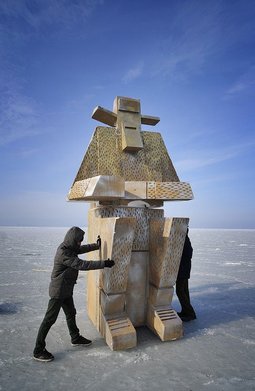 Сегодня всё было против организаторов проекта. Сильный ветер и 20-градусный мороз. Четырёхметровый рыбак никак не хотел стоять на льду. Художникам пришлось его собирать по частям.