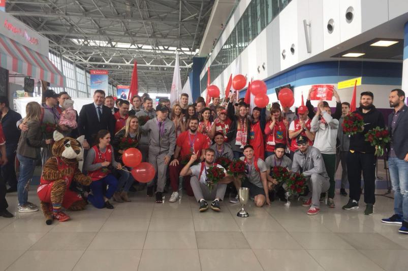Сегодня, 18 мая, баскетболисты "Спартака-Приморье" вернулись во Владивосток после триумфальной победы. В аэропорту коллектив встречали спортивные функционеры региона, в том числе вице-губернатор Приморья Павел Серебряков и директор департамента физической культуру и спорта ПК Жан Кузнецов, многочисленные болельщики родственники и друзья игроков.