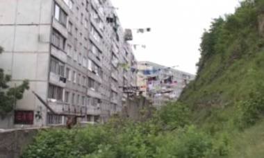 По словам местных жителей, бельевой площадки во дворе этого дома не было никогда. Размер лоджий тоже не позволяет сушить на них свои вещи. Но жители 48-го дома нашли выход из ситуации. Они натягивают обычные веревки, один из концов которых крепят на склоне рядом расположенной скалы. В то утро их сосед тоже начал протягивать бельевую веревку со своего балкона.
