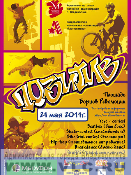 В эту субботу, 21 мая, на центральной площади Владивостока пройдет городской фестиваль альтернативных видов искусств и спорта "Позитив". В нем примет участие молодежь, катающаяся на скейтбордах, роликах, спортивных велосипедах, увлекающаяся рэпом и граффити.
