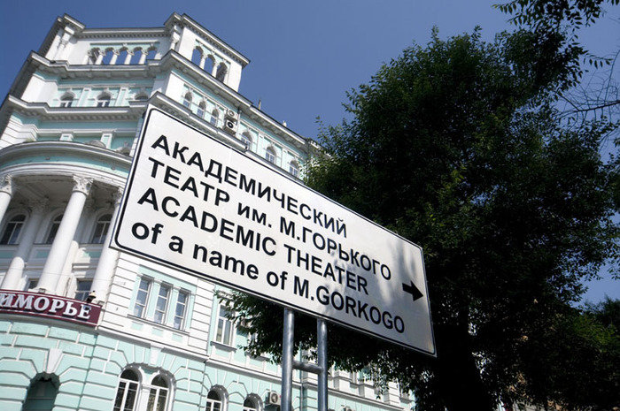 Академическому театру им. Максима Горького вообще повезло неимоверно! Он теперь «Academic Theater of a name of M. Gorkogo». Первой нашей реакцией на столь шикарный перевод было долгое и невразумительное: «Ыыы... Чооо?» Почему бы не Gorky Theatre? А что вообще означает пассаж «of a name of M. Gorkogo»? Мы бы посоветовали, если еще не поздно, исправить «M. Gorkogo» на «M. Bitter» (дословно — горький) — а что, гулять так гулять!