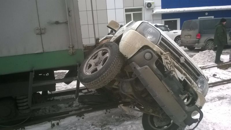 Водитель внедорожника не заметил приближения поезда и был буквально подмят многотонным составом, сообщают очевидцы происшествия.