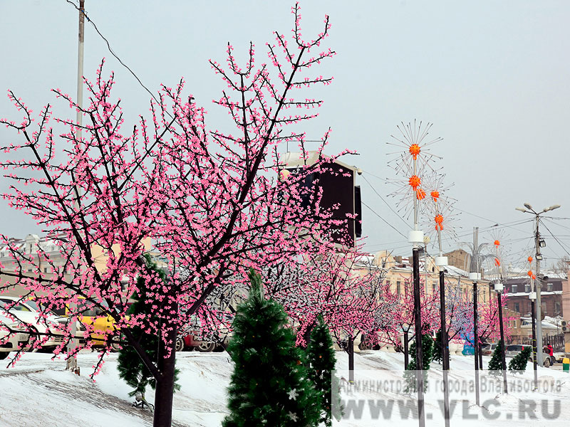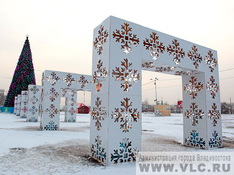 Тематические елки - "Российская" на кольце Багратиона, "Рябиновая" около Дома молодежи, "Морская" на территории Спортивной набережной, "Новогодняя" на Луговой, "Звездная" на Окатовой - уже радуют жителей и гостей города праздничным убранством и иллюминацией. Смонтирована елка около к/т "Галактика", завершается монтаж ели на площадки к/т "Нептун". Главная елка Владивостока и Приморского края, которая получила название "Центральная", нарядилась в большие шары и светодиодную иллюминацию.
