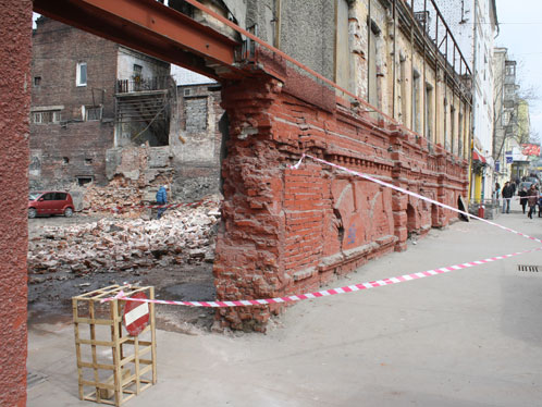 На месте обвала стены дознаватель из полиции составляет протокол места осмотра происшествия. Сергей намерен подавать в суд, если владелица здания не компенсирует ему убытки.