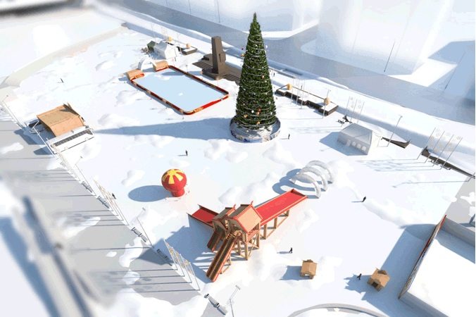 В центре площади будут установлены каток «Русские узоры», «Царь-Елка» и горка. На торговых местах рядом с елкой будут продаваться санки-«ледянки», которые позволят детям кататься с горки. Горка будет с двумя съездами, заканчивающимися световыми арками. Еще одна световая арка будет установлена у входа на каток.