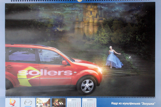 Необычный календарь выпустил завод «Соллерс» во Владивостоке. На его страницах запечатлены не только образцы корейского автопрома, которые собирают во Владивостоке, но и сами горожане. Владивостокцы выступили в роли знаменитых актеров: Вин Дизеля, Николаса Кейджа, Уилла Смита и даже Вицина и Моргунова. Узнаваемы на календаре разные уголки Владивостока: улица Светланская, набережная Цесаревича, порт.Не обошлось и без курьезов. Стилизация под знаменитую сказку получилась двусмысленной. Золушка выбегает к оранжевому авто с надписью Sollers, а даже дети знают, во что превратится карета после того, как часы пробьют 12.